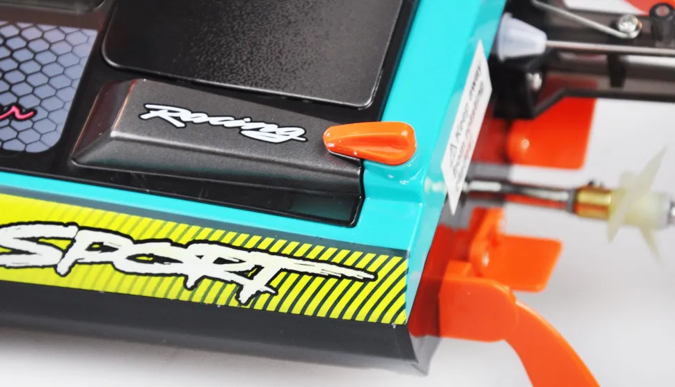 L’émetteur 2,4 GHz sensible avec diverses possibilités de réglage, comme par exemple le trim de la direction et le Dual Rate pour la vitesse, assure un comportement direct et contrôlé. Les plaques de trim et les ailerons de trim déjà montés sur le bateau assurent une stabilité supplémentaire dans les virages rapides ou sur les eaux agitées. La coque est doublement étanche et donc parfaitement protégée contre les infiltrations d’eau. De plus, une bande LED claire est placée sous le couvercle transparent. Elle peut être activée et désactivée via la télécommande et offre une optique séduisante même au crépuscule. Lorsque la tension de l’accu du modèle est faible, l’émetteur émet un bip et signale ainsi qu’il est nécessaire de revenir immédiatement à la rive.