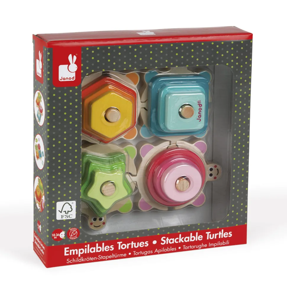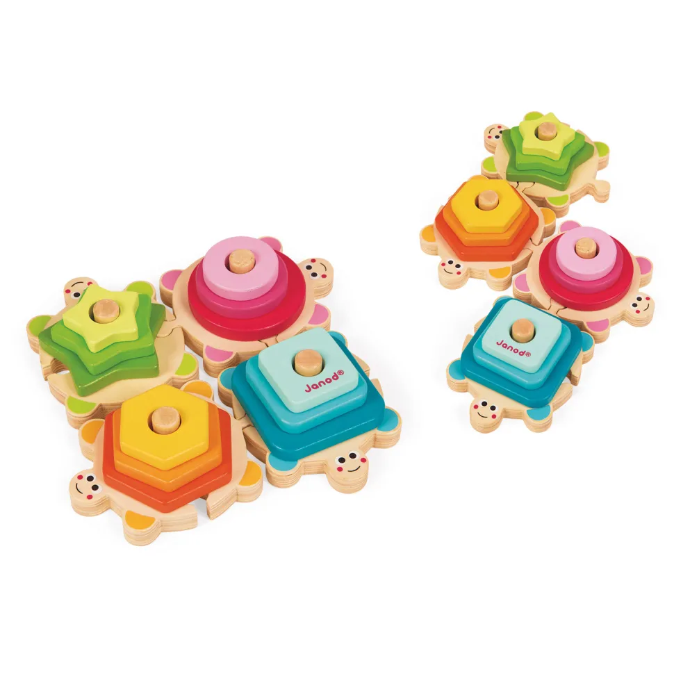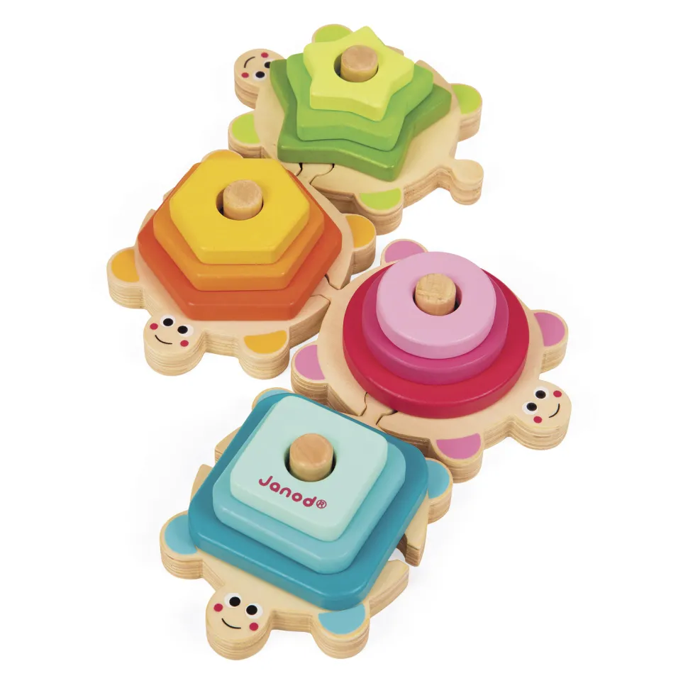 4 tortues rigolotes avec 12 pièces colorées à empiler. Idéal pour apprendre les formes et les couleurs et aider bébé à développer la coordination entre ses mains et ses yeux. Les 4 tortues peuvent se détacher ou s’attacher très facilement entre elles. Jouet peint à l’eau.Produit labellisé FSC : les bois utilisés pour sa fabrication proviennent de forêts gérées de manière responsable.