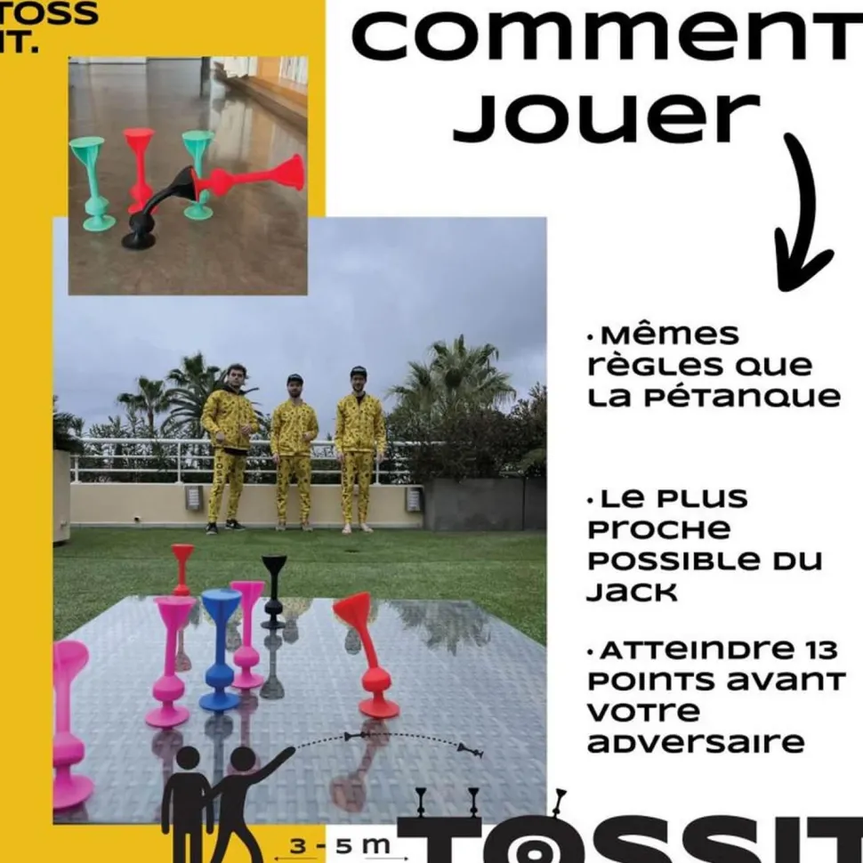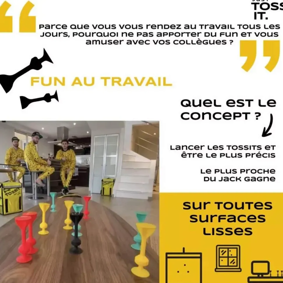TOSSIT est un jeu de précision mélangeant les fléchettes et la pétanque. Grâce aux ventouses situées à chaque bout des projectiles, TOSSIT peut se jouer à l’extérieur comme à l’intérieur ! Ses ventouses s’accrochent sur pleins de types de surfaces : fenêtre, sol, voiture, plafond… Parfait pour jouer avec ses amis, sa famille ou entre collègues !