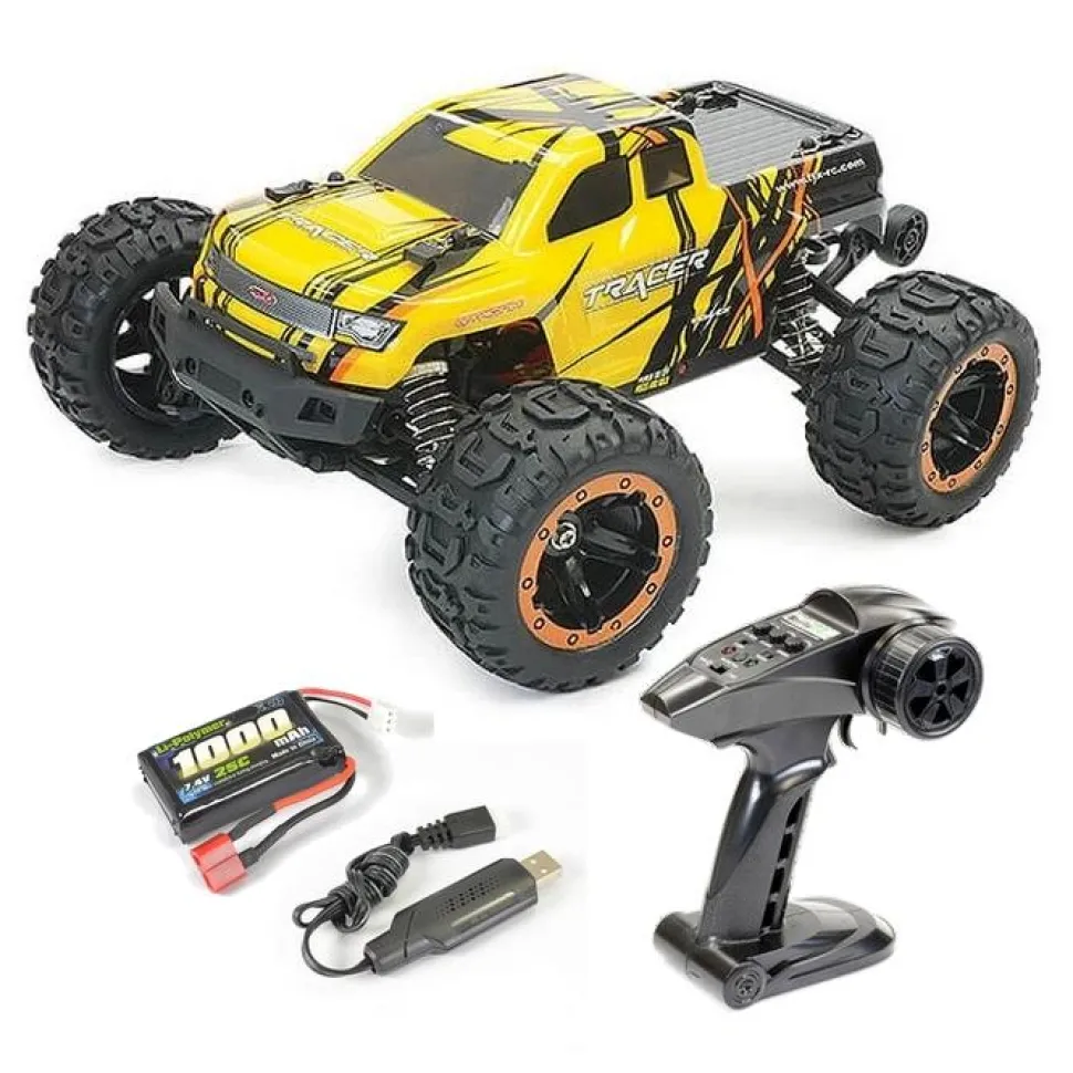 Description du produit : Tracer RTR 1/16 4WD Brushless Monster Truck – Jaune