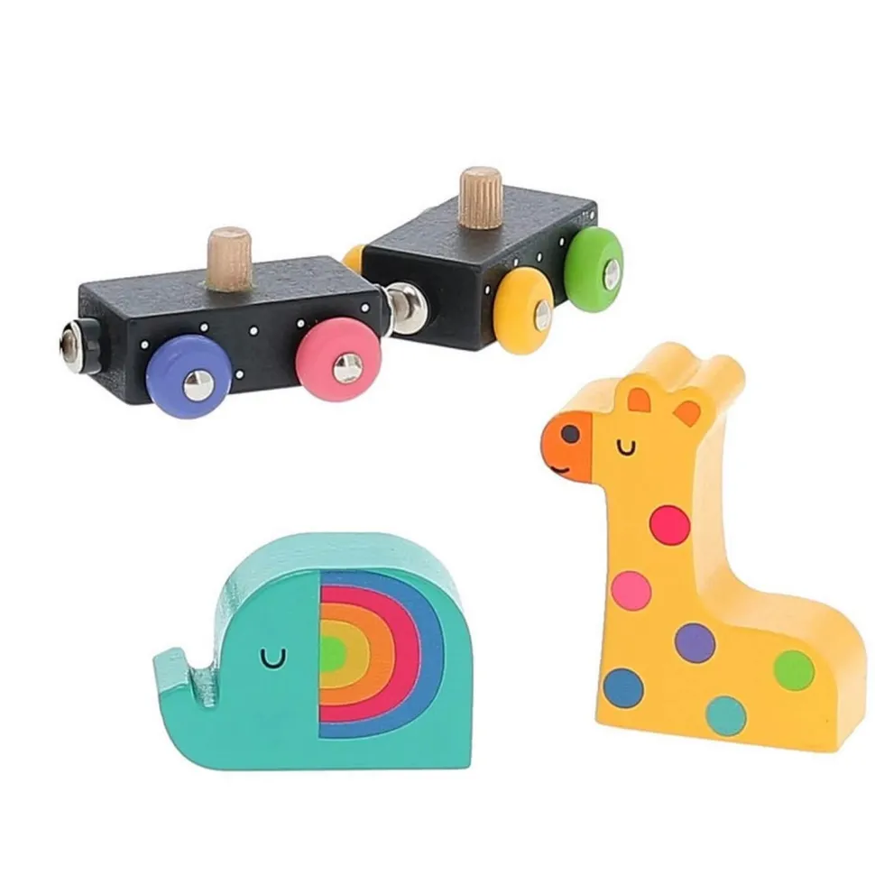 Retrouvez ce joli petit train en bois possédant une loco-croco surmontée d’un toucan, suivie de ses compagnons le lion, la girafe et l’éléphant arc-en-ciel. Ce petit train permettra aux enfants de jouer avec ces animaux amovibles et de les remettre sur leurs wagons aimantés pour les promener.