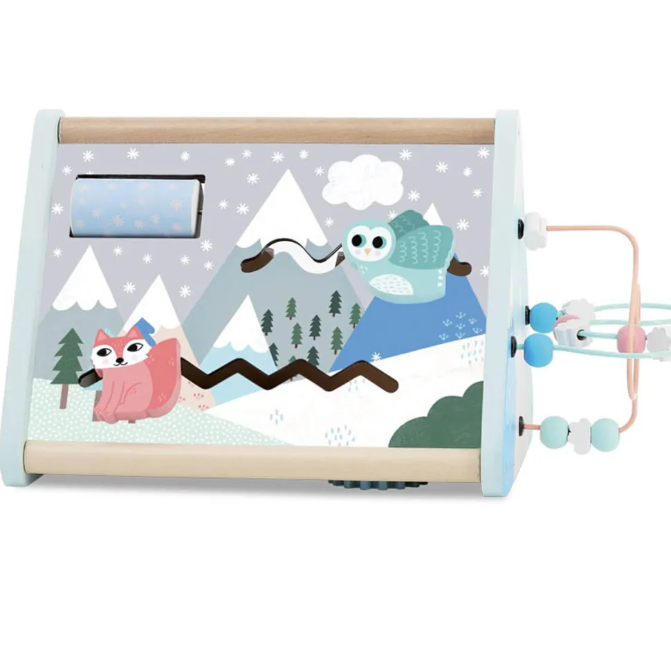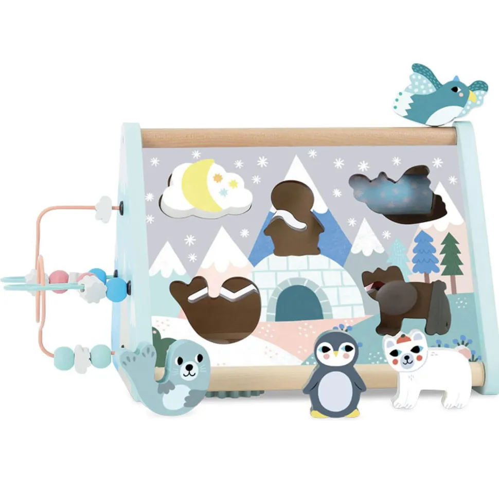 Que de choses à découvrir : des engrenages à actionner, des petites têtes à pivoter, un hibou et un renard à faire voyager, un cylindre de neige à faire tourner et des perles et nuages à déplacer sur un fil ! Dans l’igloo de l’ours, une petite porte latérale avec des charnière élastiques permet à l’enfant de récupérer les pièces qu’il aura encastrées sur un des côtés.