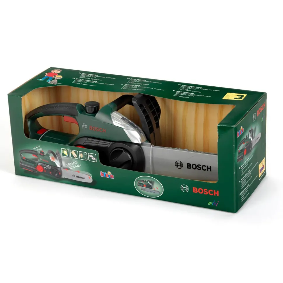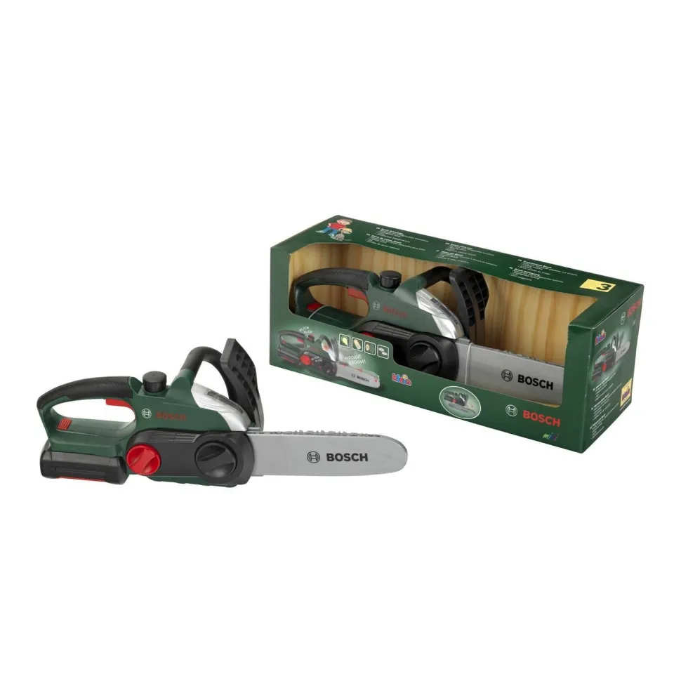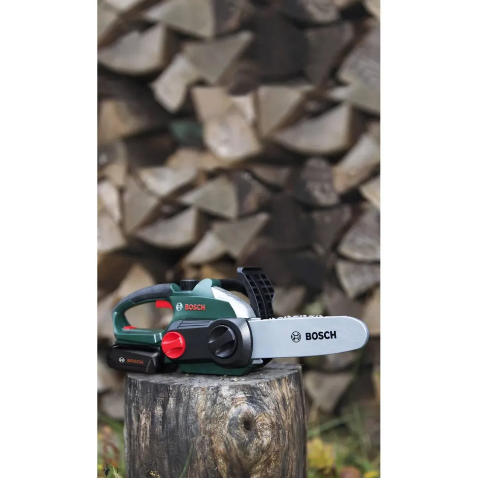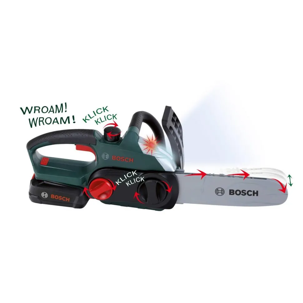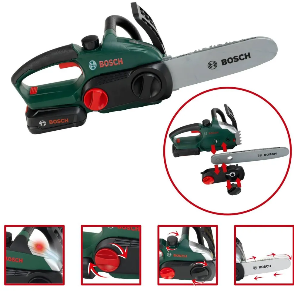 Cette tronçonneuse aux couleurs d’un modèle original Bosch propose des fonctions adaptées aux enfants à partir de 3 ans. En sciant, la tronçonneuse reproduit le bruit réaliste de la scie et clignote.