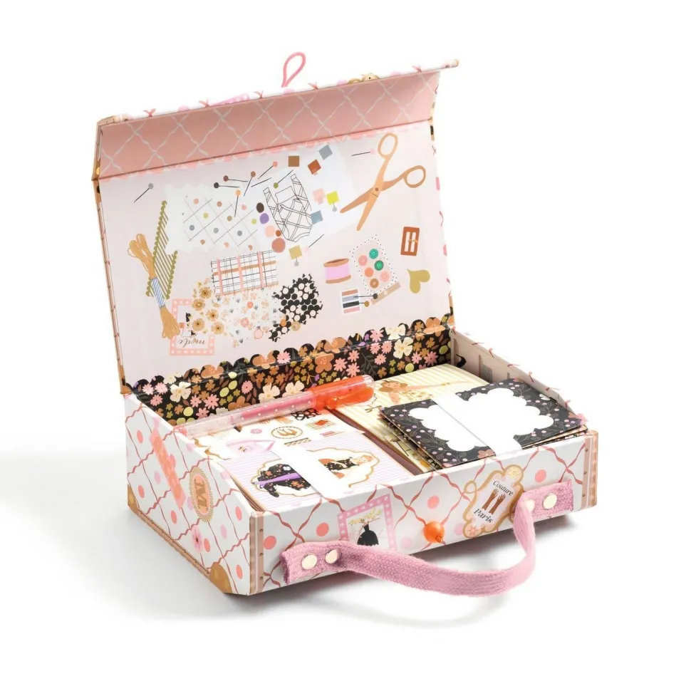 Contenu : 1 coffret valise, 1 cahier, 1 bloc-notes, 1 stylo gel rose, 4 enveloppes, 4 cartes d’invitation, 4 planches de stickers