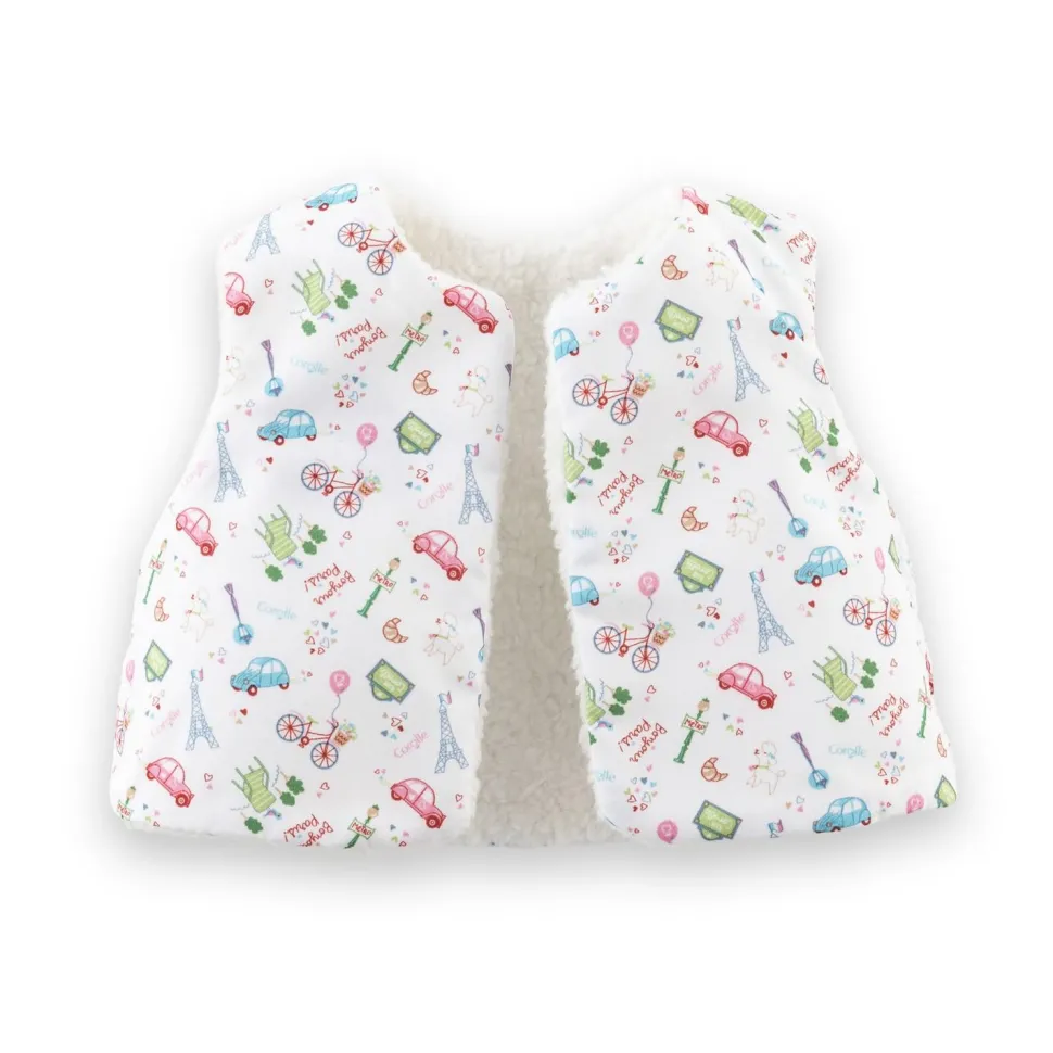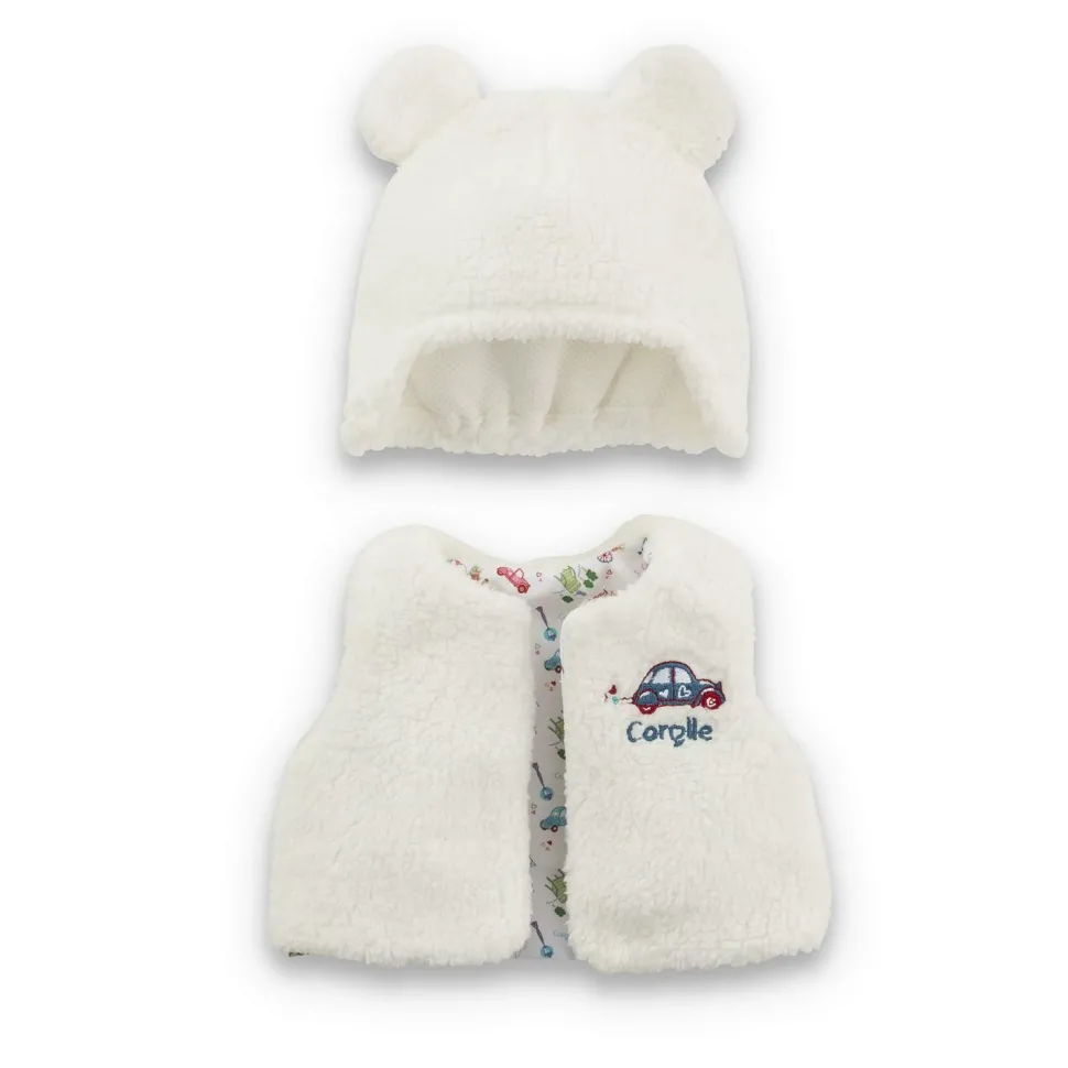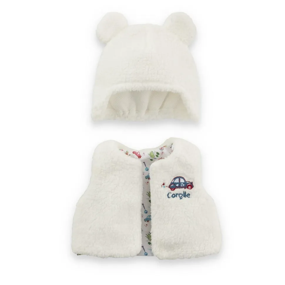 Il est composé d’un joli gilet sans manche tout doux et d’un bonnet tout moelleux avec des oreilles d’oursons pour garder son poupon bien au chaud. La doublure du gilet présente le tissu exclusif de la collection Week-End à Paris avec des clins d’oeils à des éléments urbains de la capitale de la France. On retrouve d’ailleurs une petite voiture brodée sur le devant du gilet.