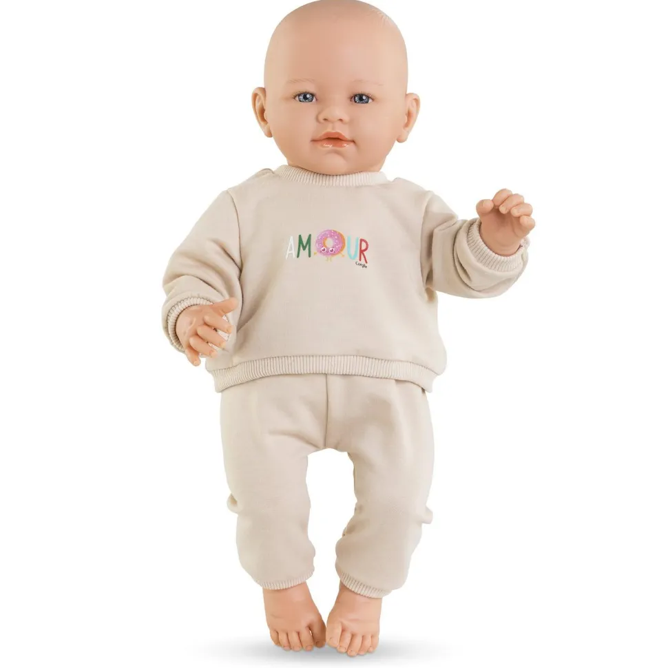 Pour une tenue décontractée, l’ensemble Jogging Beige (2 pièces) est le vêtement idéal pour les grands poupons de 42 cm mon grand poupon Corolle.