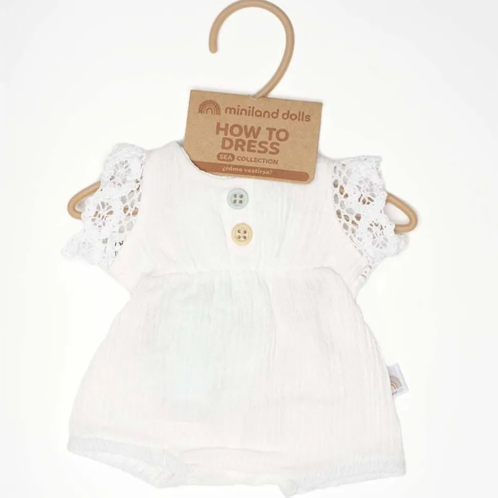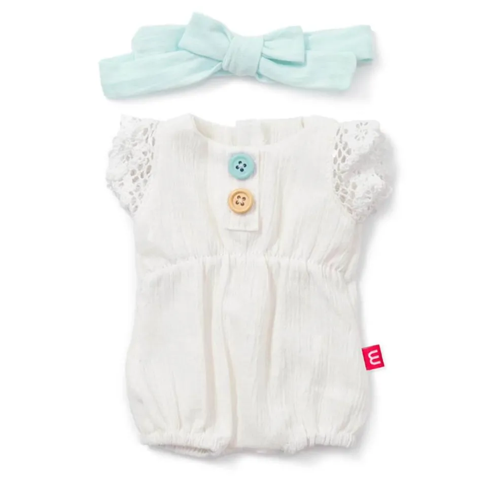 Cet ensemble de la marque Miniland convient aux poupées mesurant 38 cm. Il se compose d’une barboteuse en tissu léger blanc à manches courtes en dentelle et d’un bandeau à noeud de couleur bleu ciel.Découvrez sur notre site toutes nos poupées de marque Miniland mesurant 38 cm que vous pourrez habiller avec cette tenue!