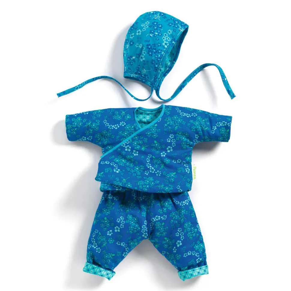 Ensemble de vêtements pour poupon Poméa de la marque Djeco comprenant un pantalon, un pull et un béguin.