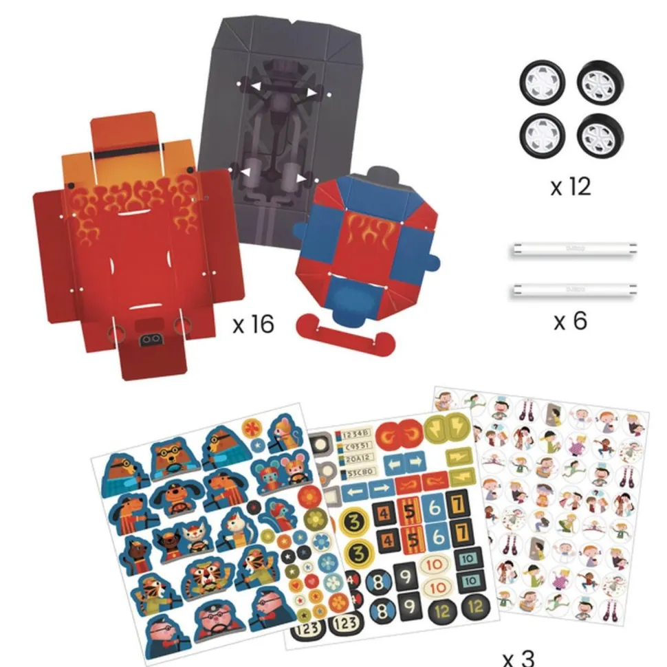 Découvrez ce coffret comprenant 3 voitures de course à assembler soi-même de la marque Djeco.