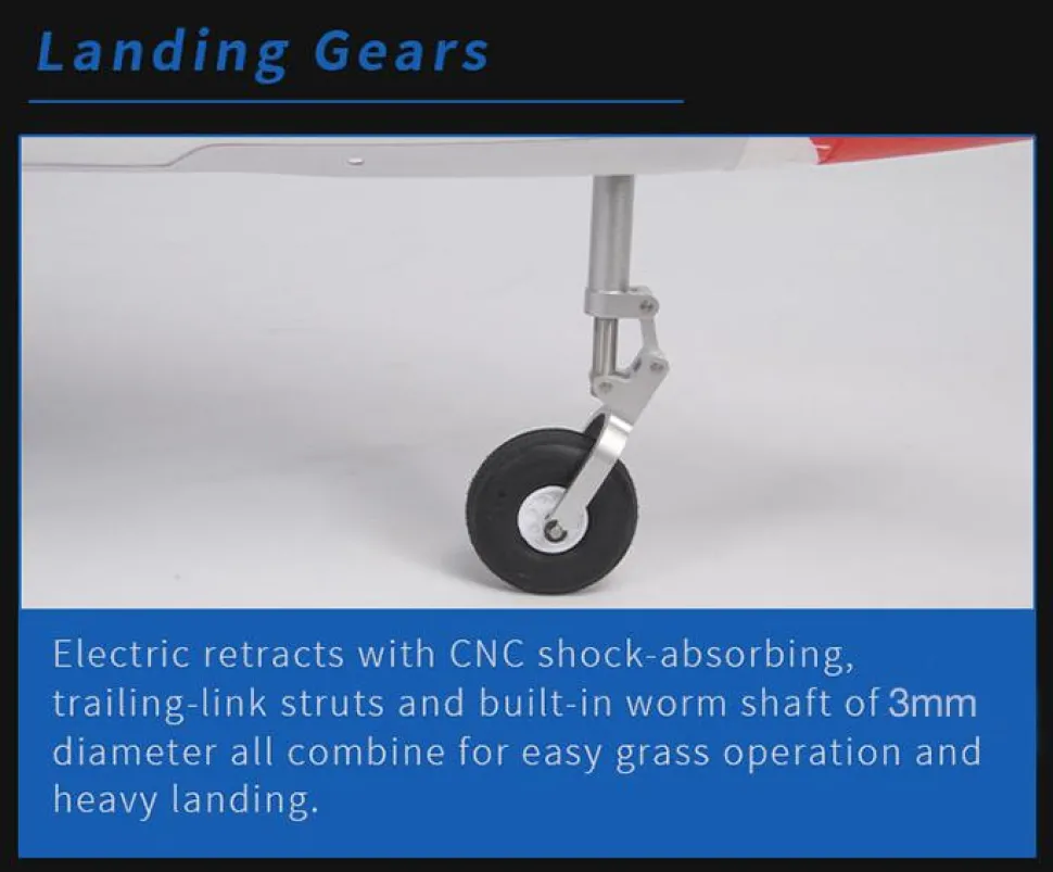 Les rétracteurs électriques avec amortisseurs CNC, les jambes de traîne et l’arbre à vis sans fin intégré de 10mm de diamètre se combinent pour un fonctionnement facile sur l’herbe et un atterrissage lourd.